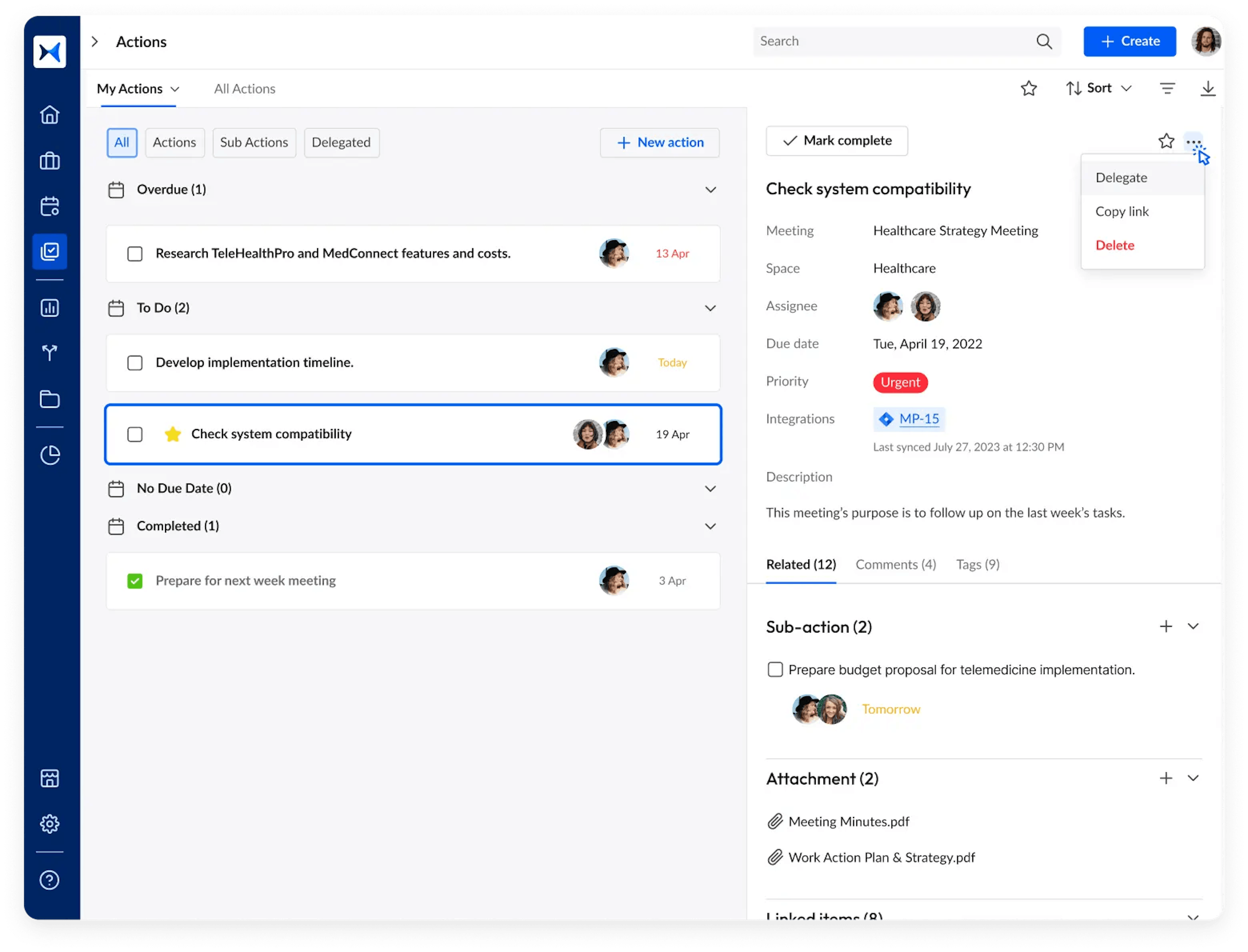 - Action management: Automated tracking of decisions and tasks ensures follow-through on critical financial actions, such as regulatory filings, loan approvals, or fraud investigations. AI-powered reminders prevent delays, keeping fintech and banking teams aligned on compliance deadlines and business goals.